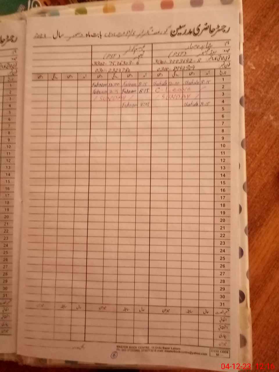 | CNIC | Full Name | Designation | R/C | Absence During Last Calender Month |