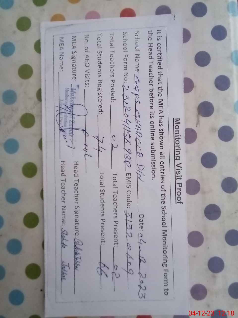 | Attendance Register | Head Teacher | MEA with School | Visit Proof |