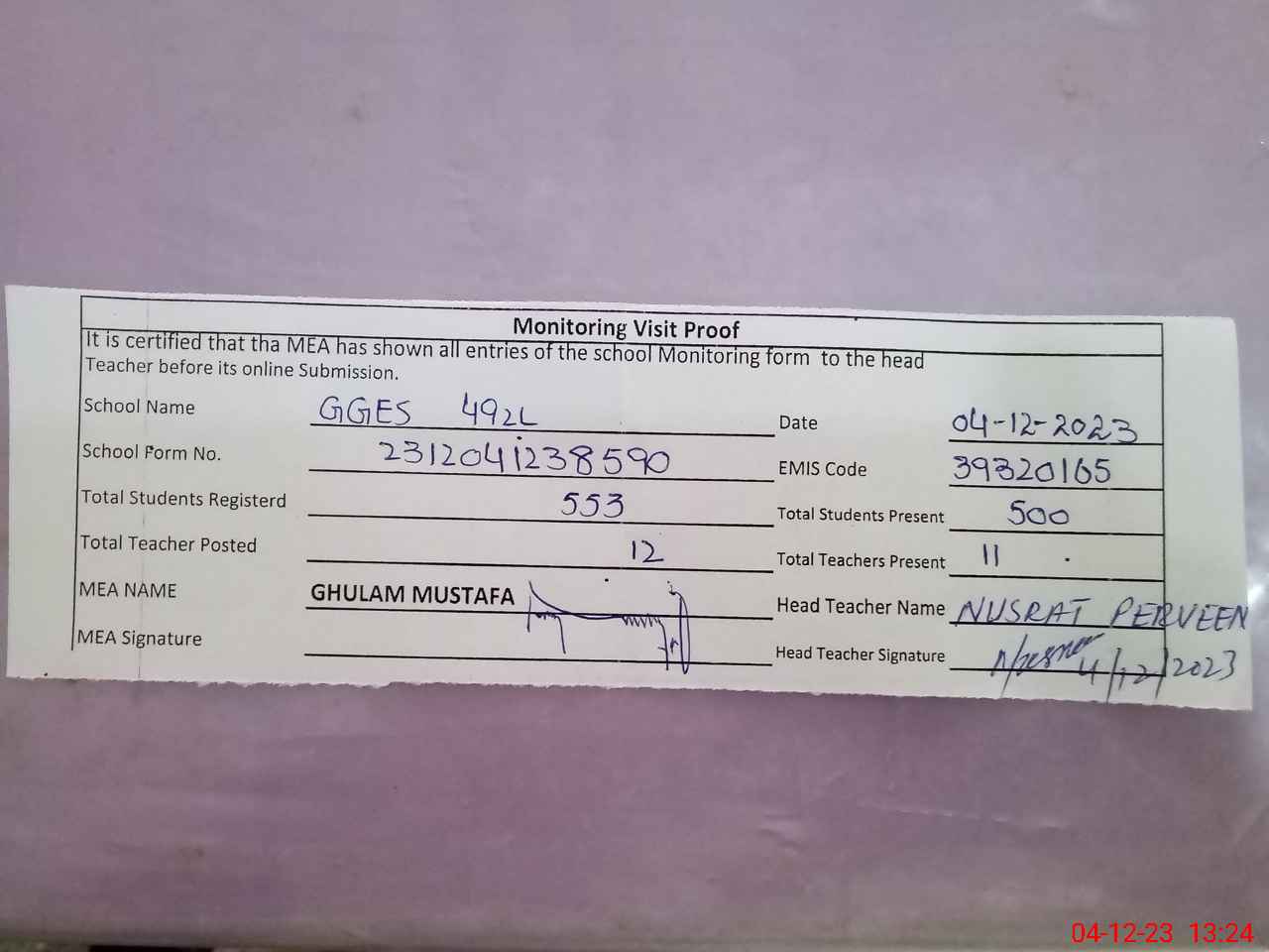 | Attendance Register | Head Teacher | MEA with School | Visit Proof |