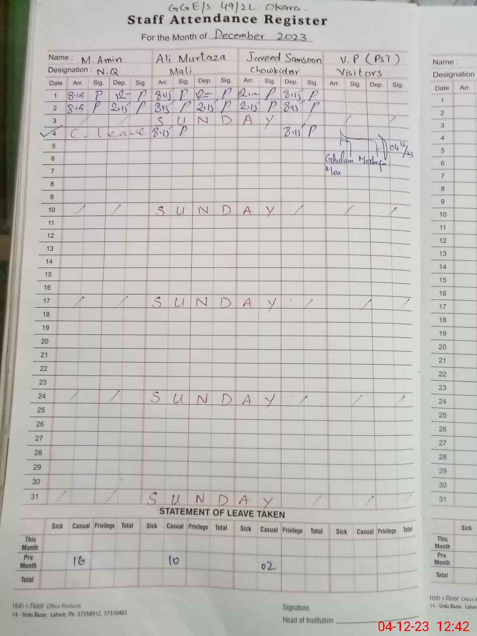 | CNIC | Full Name | Designation | R/C | Absence During Last Calender Month |