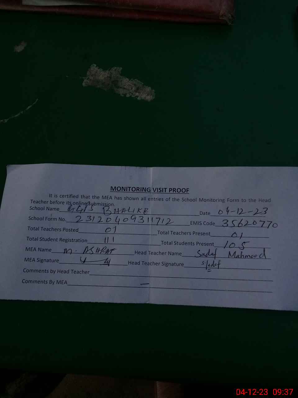 | EMIS Code: 35620770 | Name of School: GGPS BHALIKE STATION | |||
