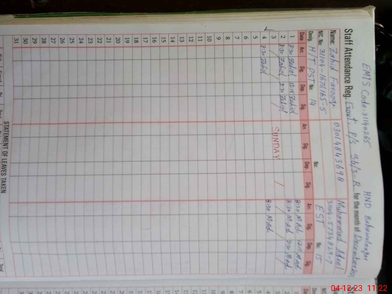 | Name: Za**** Fa**** Designation: (School Headmaster's/Headmistress's) PST Phone/Cell Number: 03**** |