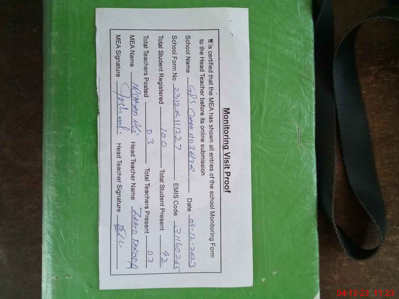 | Attendance Register | Head Teacher | MEA with School | Visit Proof |