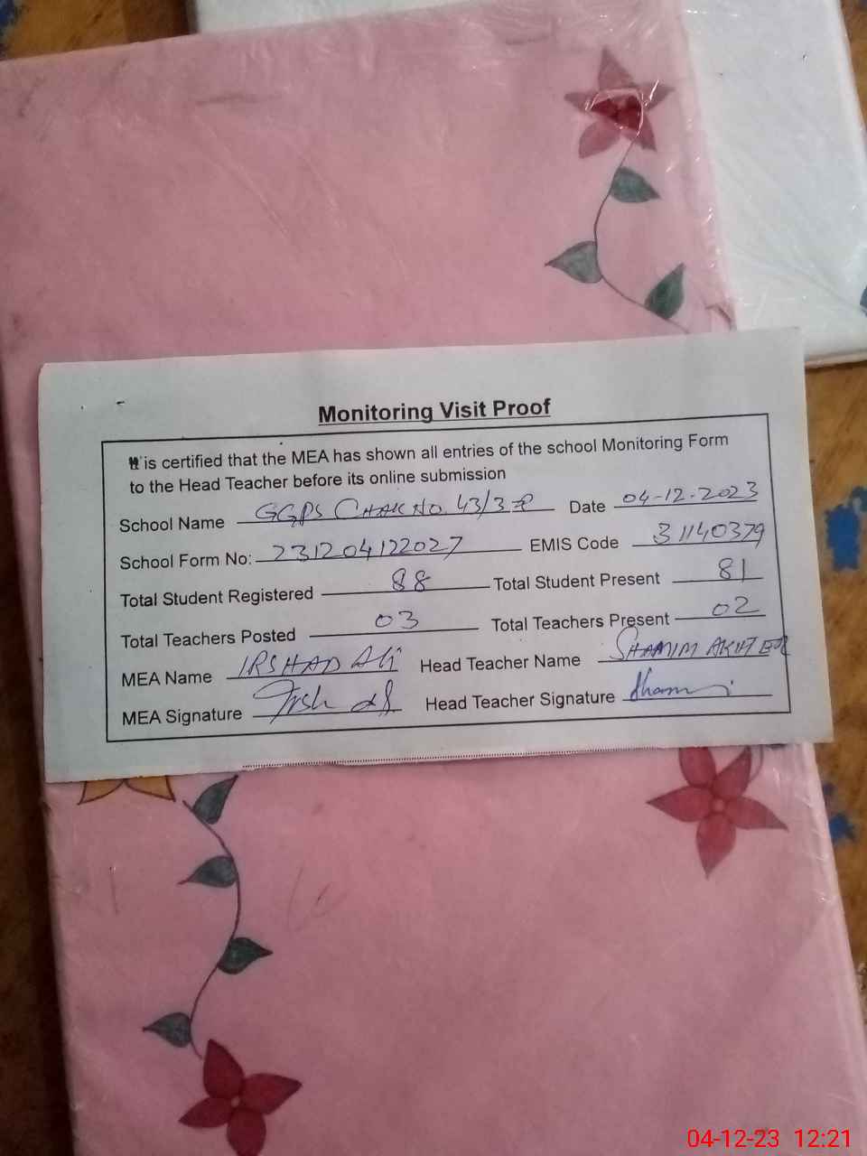 | Attendance Register | Head Teacher | MEA with School | Visit Proof |