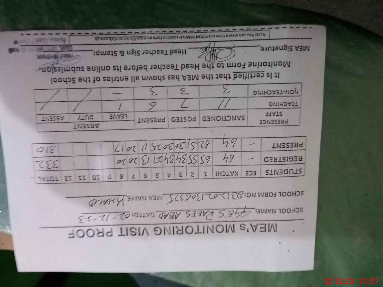 | Attendance Register | Head Teacher | MEA with School | Visit Proof |