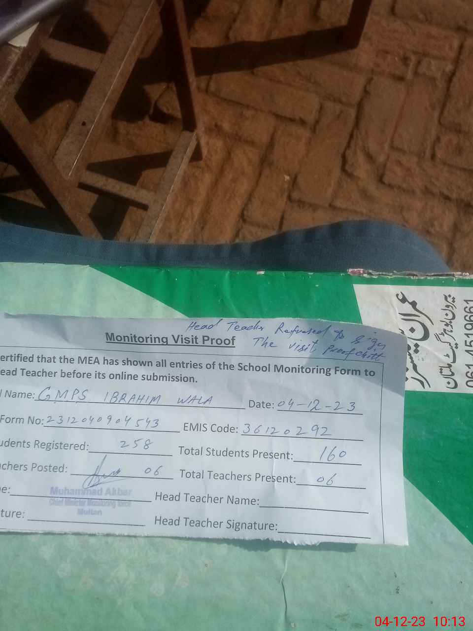 | Remarks (Use Separate Page if Required): Head Teacher refused to sign the visit proof chitt | |||||