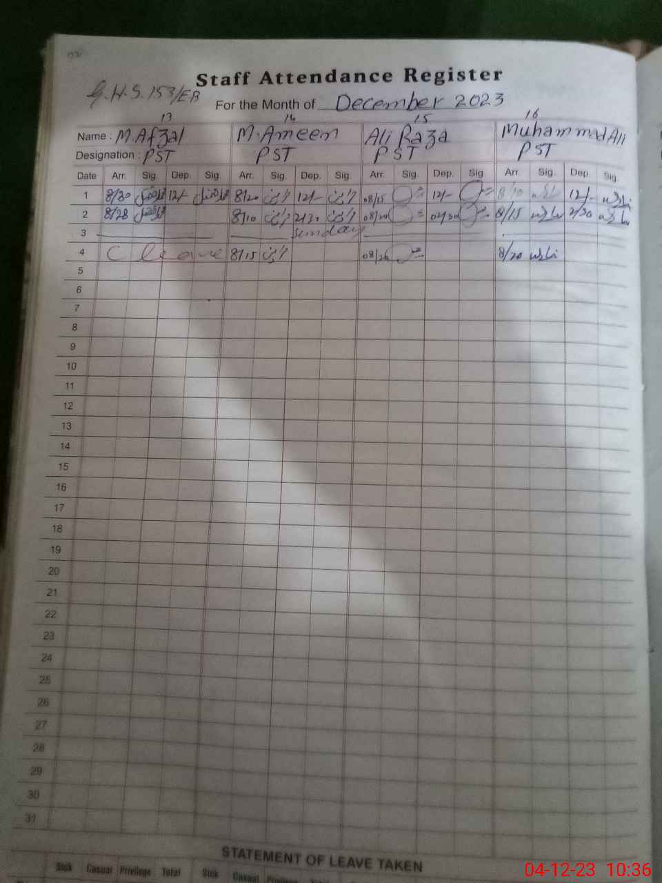 | CNIC | Full Name | Designation | R/C | Absence During Last Calender Month |