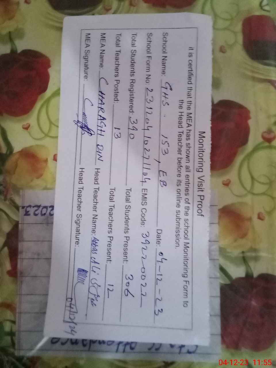 | Attendance Register | Head Teacher | MEA with School | Visit Proof |