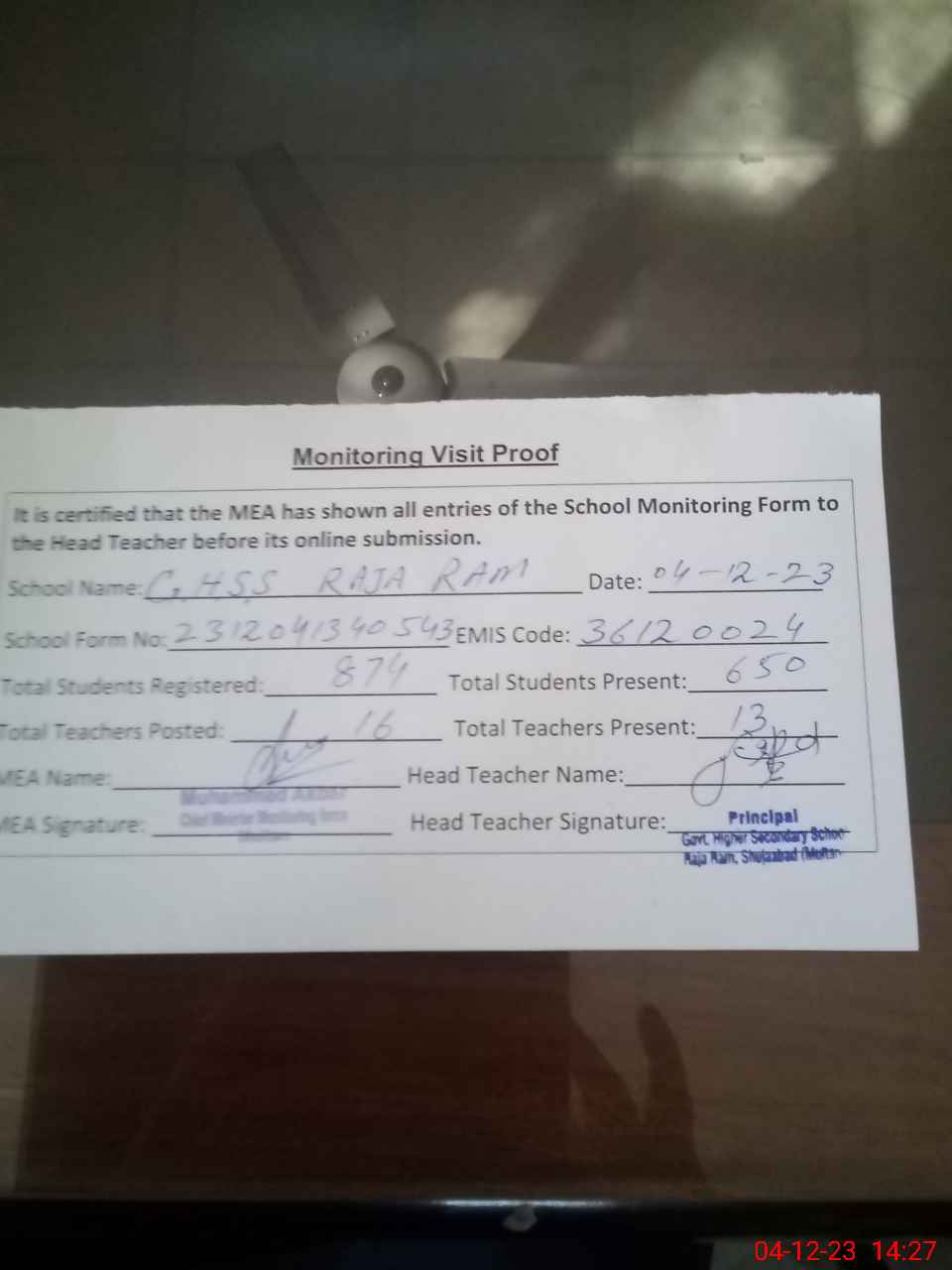 | Attendance Register | Head Teacher | MEA with School | Visit Proof |