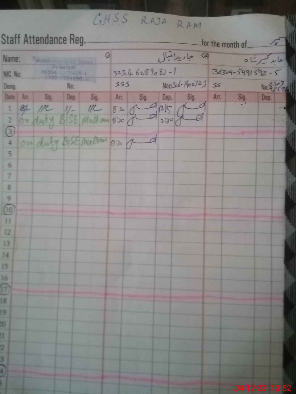 | CNIC | Full Name | Designation | R/C | Absence during last cal. month |