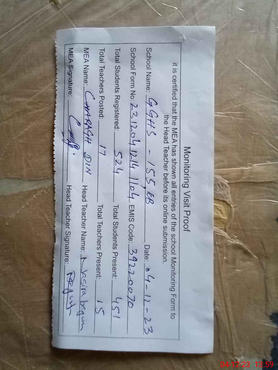 | Attendance Register | Head Teacher | MEA with School | Visit Proof |