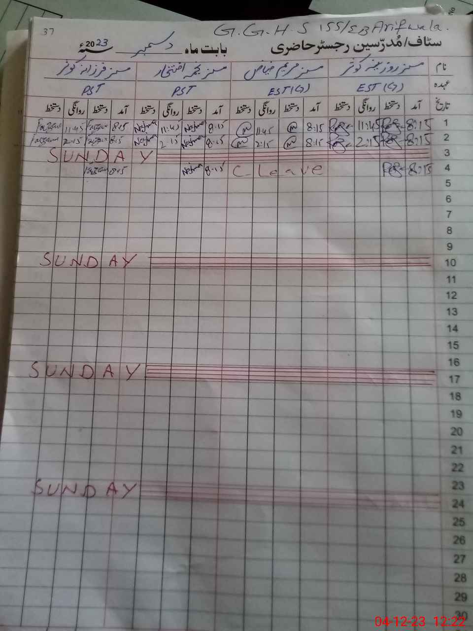 | CNIC | Full Name | Designation | R/C | Absence During Last Calender Month |