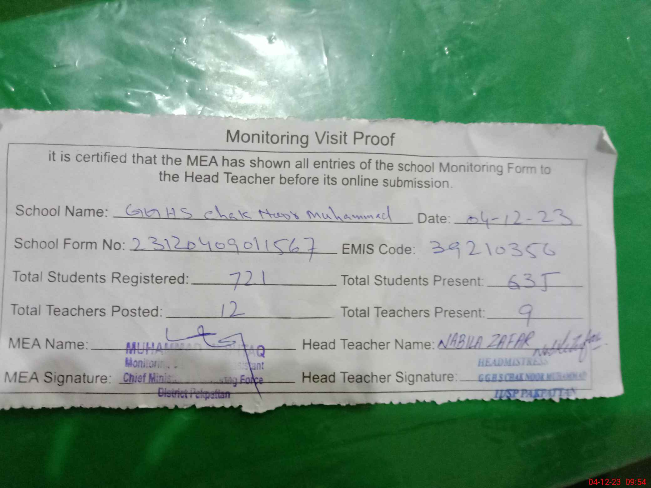 | EMIS Code: 39210356 | Name of School: GGHS CHAK NOOR MUHAMMAD 11/SP | |||