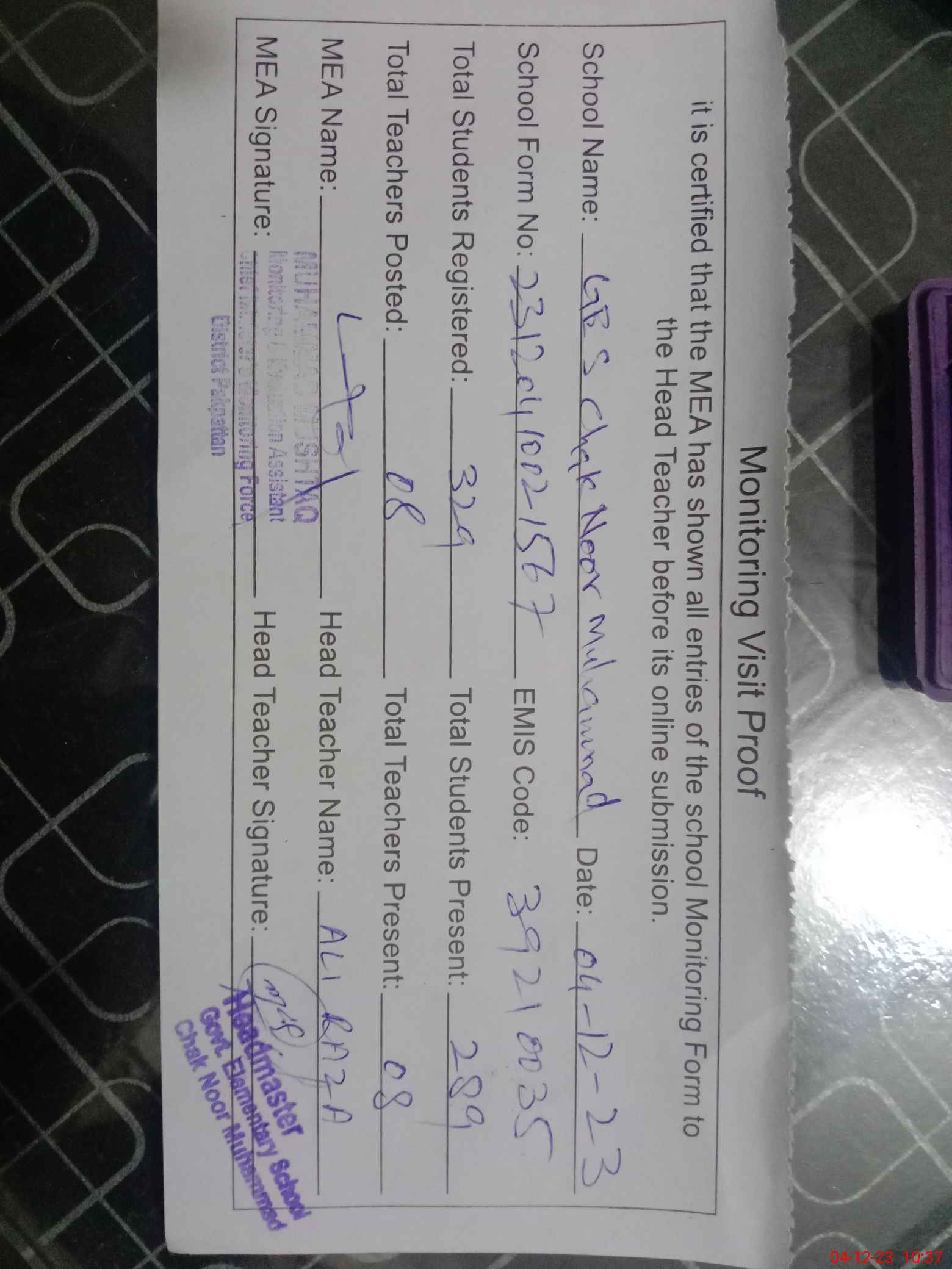 | Attendance Register | Head Teacher | MEA with School | Visit Proof |