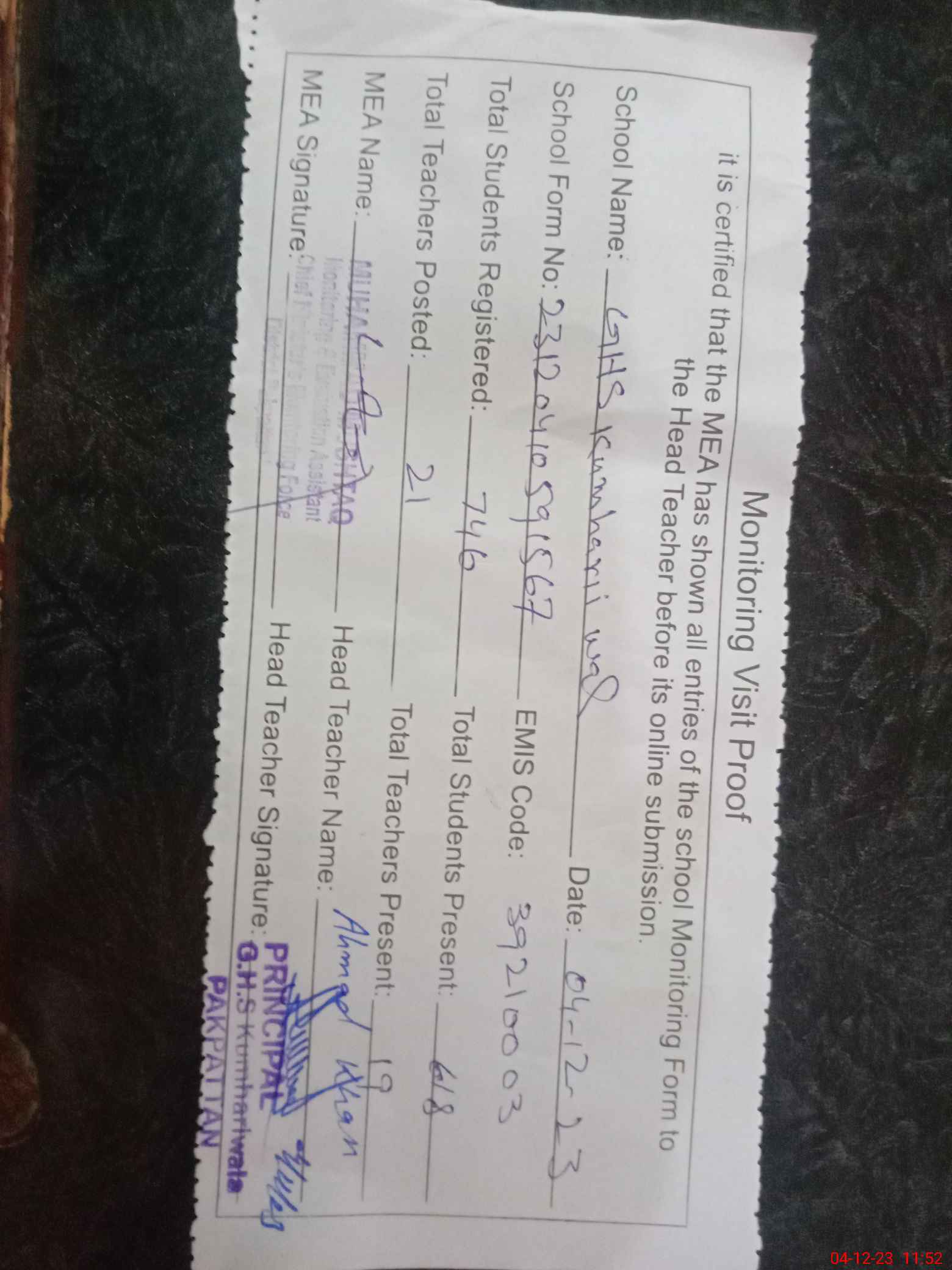 | EMIS Code: 39210003 | Name of School: GHS KUMHARAI WALA | |||