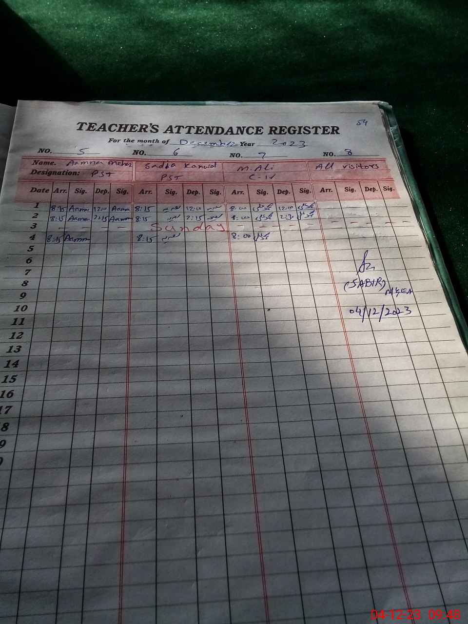 | CNIC | Full Name | Designation | R/C | Absence During Last Calender Month |