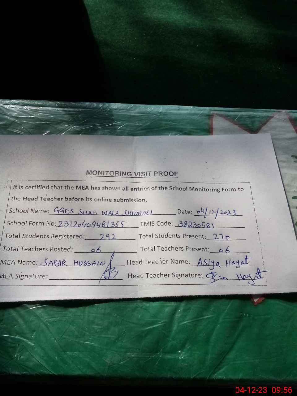 | Attendance Register | Head Teacher | MEA with School | Visit Proof |