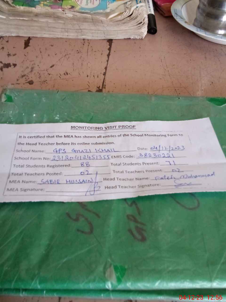 | Attendance Register | Head Teacher | MEA with School | Visit Proof |