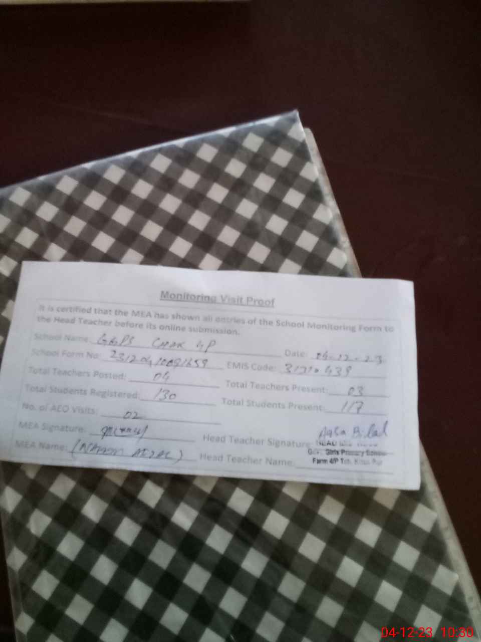 | EMIS Code: 31310439 | Name of School: GGPS CHAK NO 4/P | |||