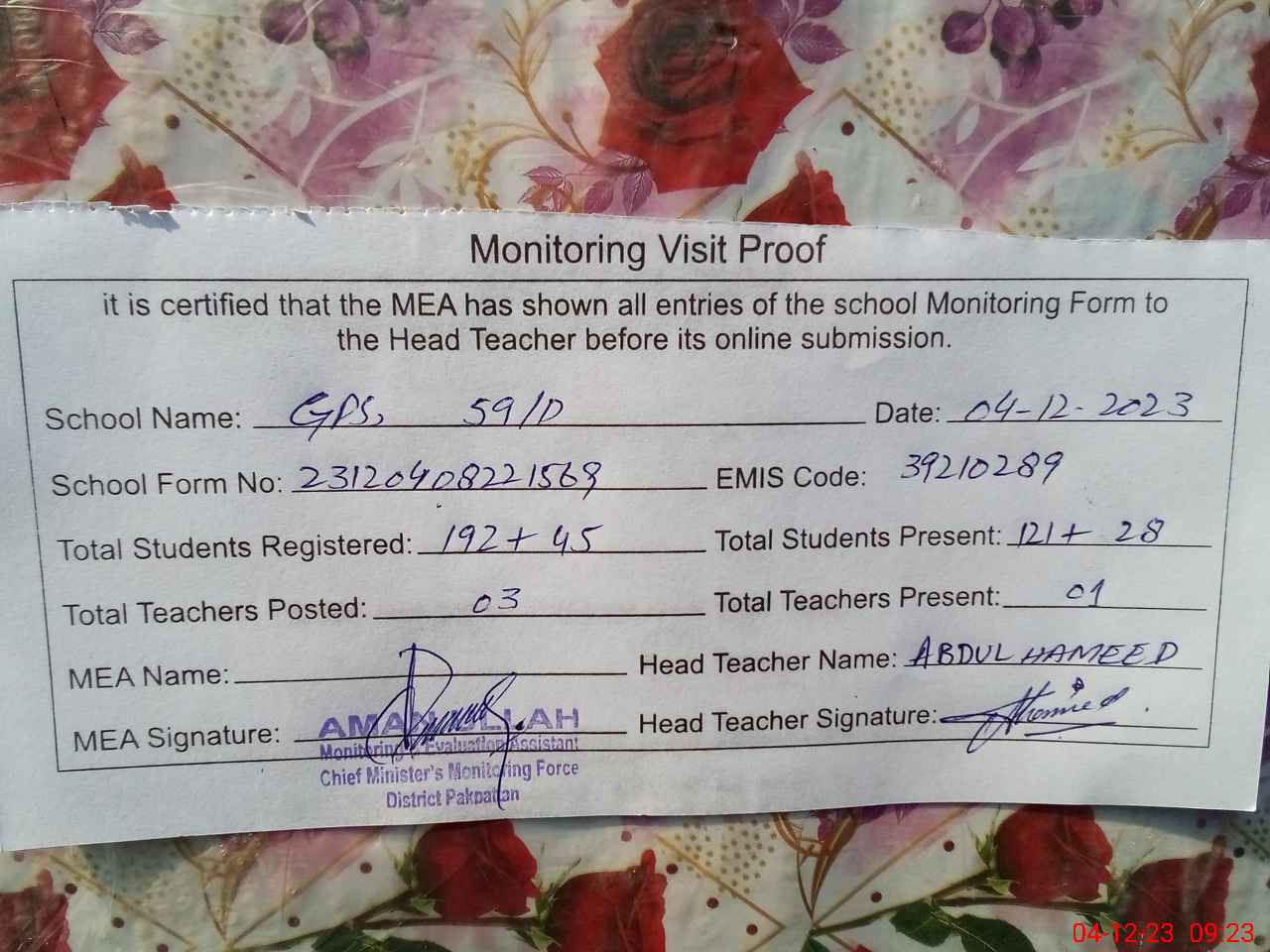 | Attendance Register | Head Teacher | MEA with School | Visit Proof |