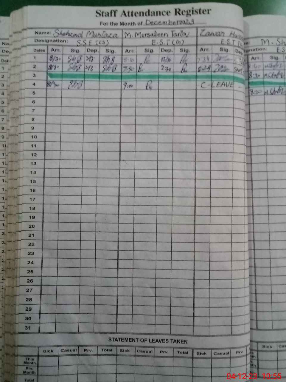 | CNIC | Full Name | Designation | R/C | Absence During Last Calender Month |