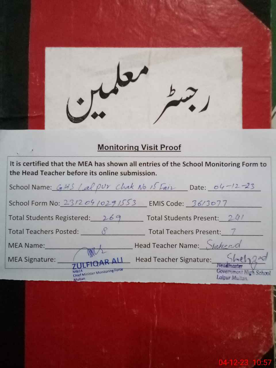 | Attendance Register | Head Teacher | MEA with School | Visit Proof |