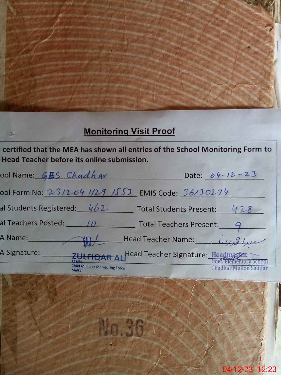 | Attendance Register | Head Teacher | MEA with School | Visit Proof |