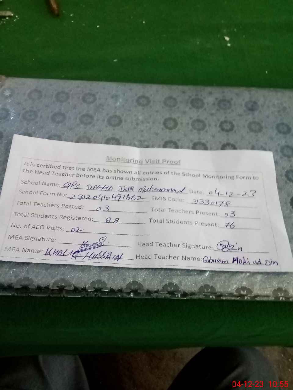 | Attendance Register | Head Teacher | MEA with School | Visit Proof |