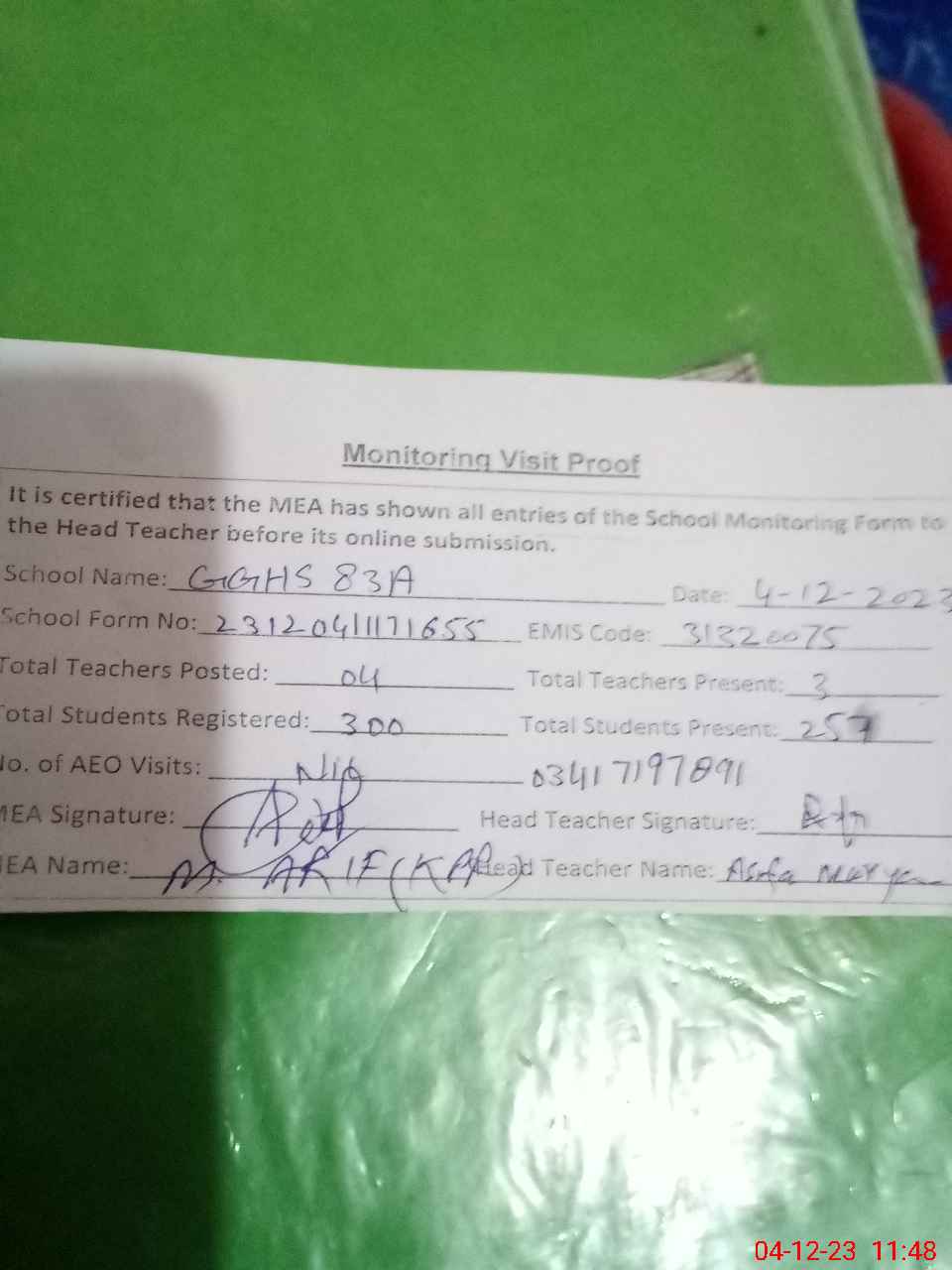 | Attendance Register | Head Teacher | MEA with School | Visit Proof |