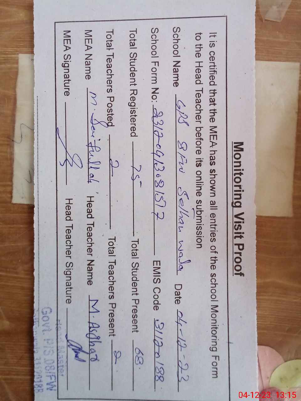 | Attendance Register | Head Teacher | MEA with School | Visit Proof |