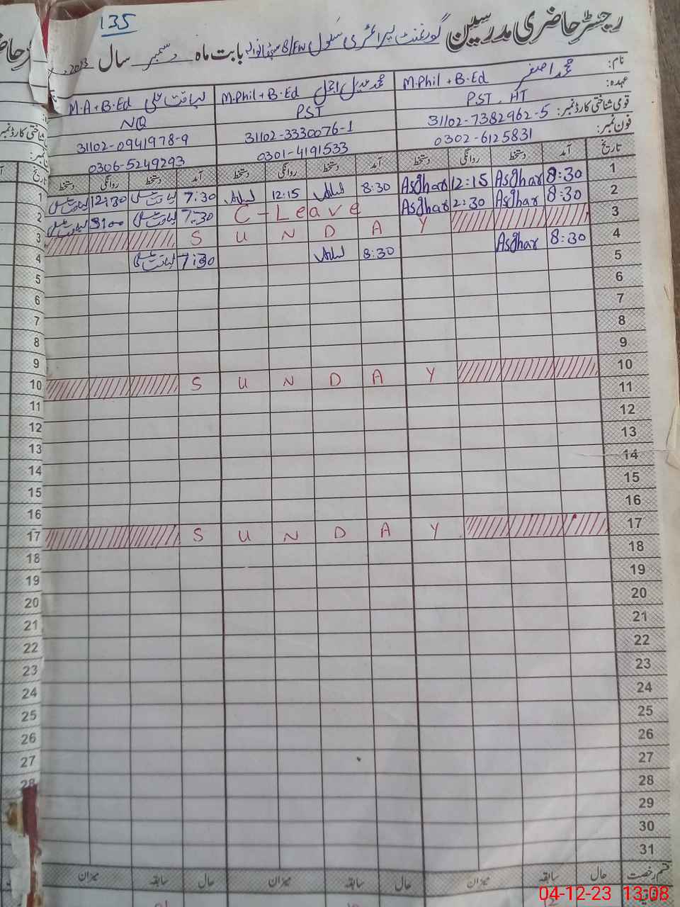 | CNIC | Full Name | Designation | R/C | Absence During Last Calender Month |