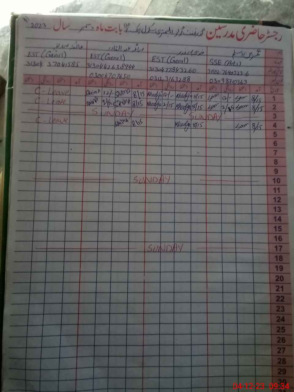 | CNIC | Full Name | Designation | R/C | Absence During Last Calender Month |