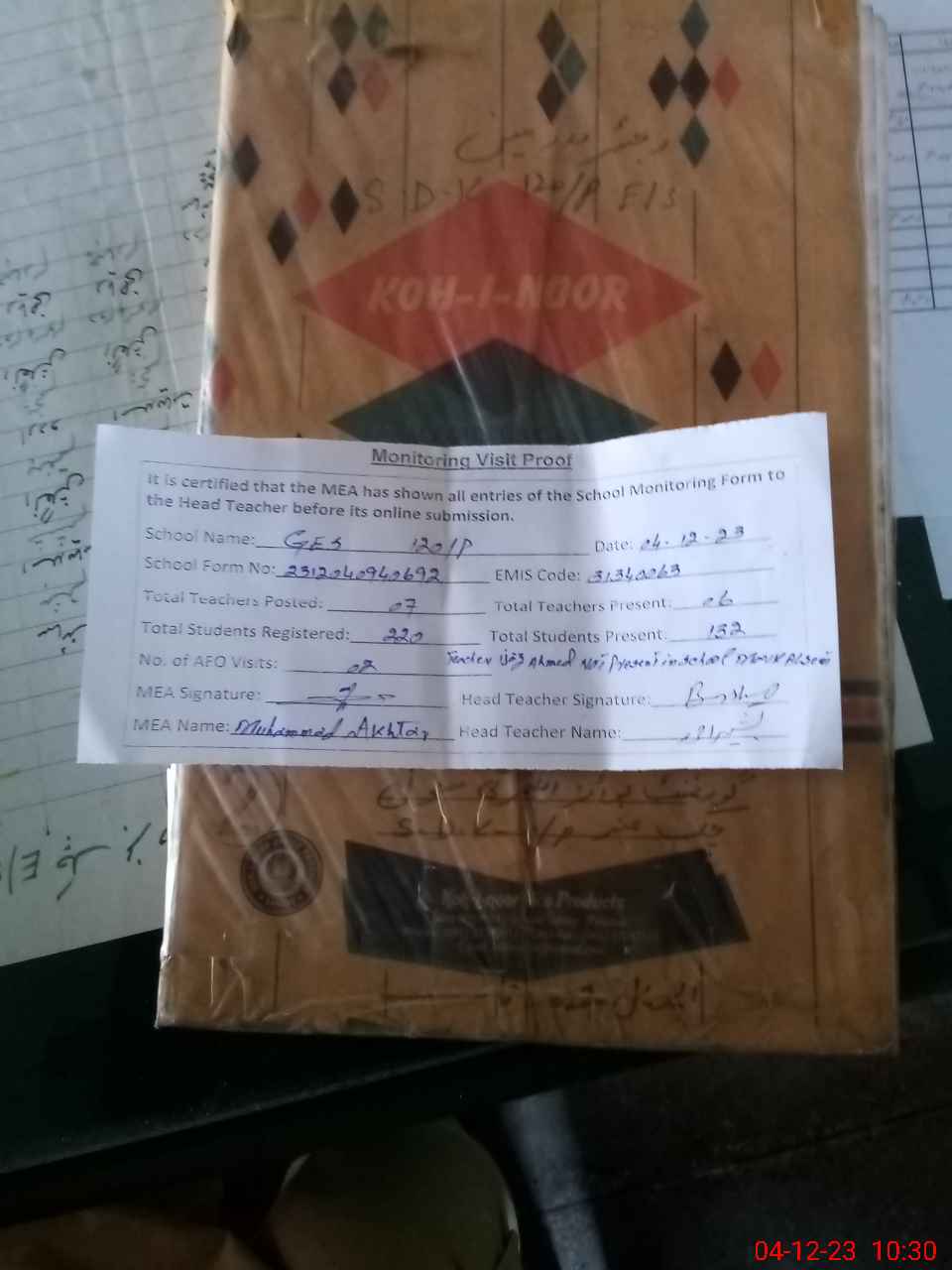 | Attendance Register | Head Teacher | MEA with School | Visit Proof |
