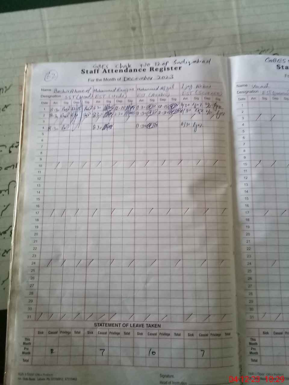 | Remarks (Use Separate Page if Required): Teacher ijaz Ahmed not arivel in school last one month Mark Absent | |||||