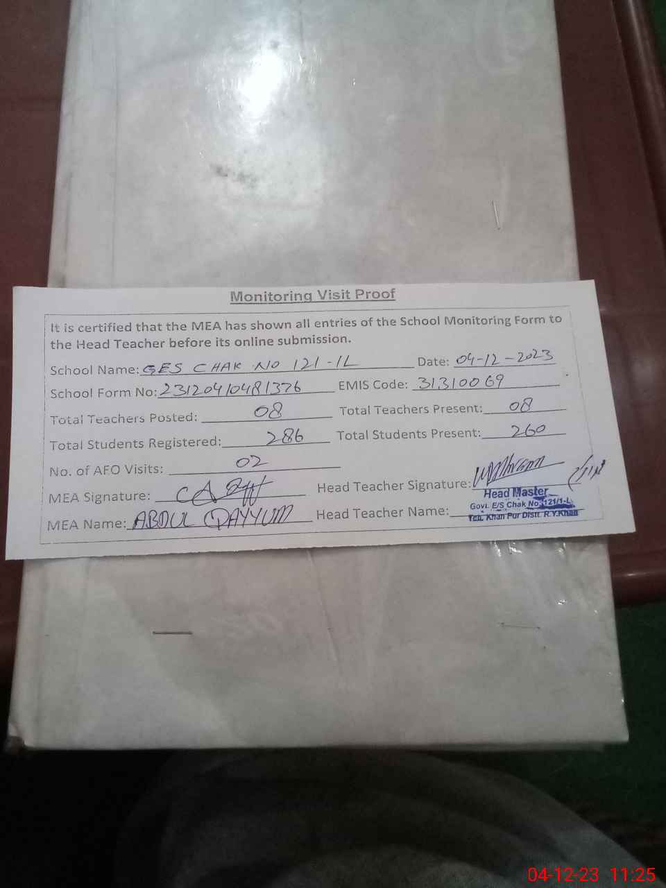| EMIS Code: 31310069 | Name of School: GES CHAK NO 121/1-L | |||