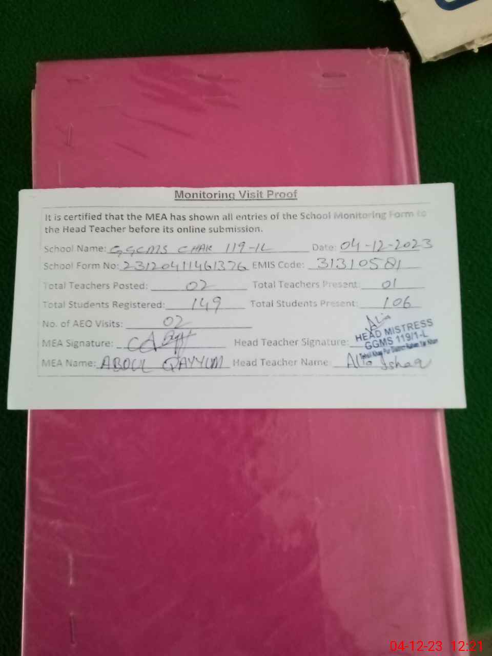 | Attendance Register | Head Teacher | MEA with School | Visit Proof |