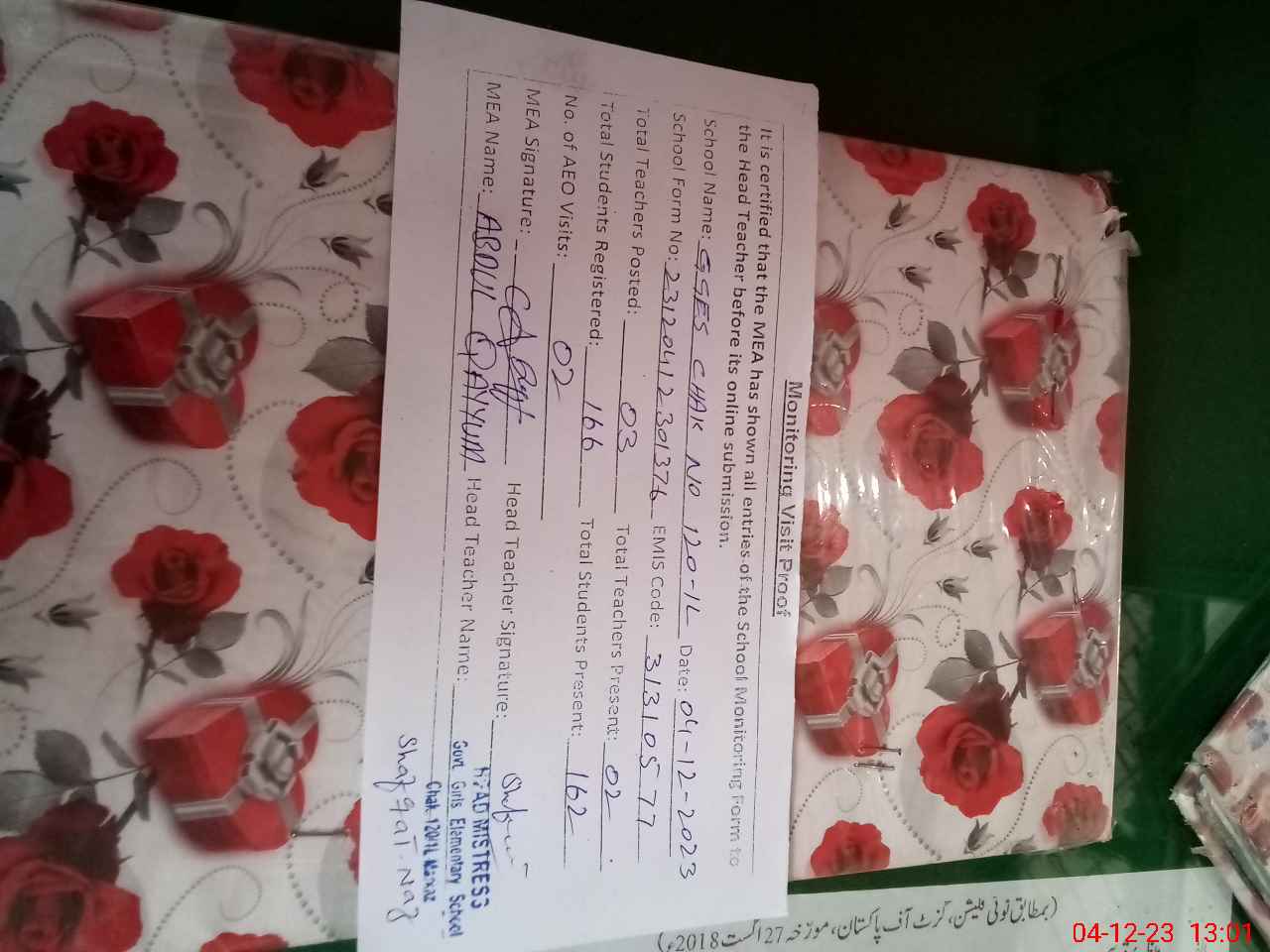 | Attendance Register | Head Teacher | MEA with School | Visit Proof |