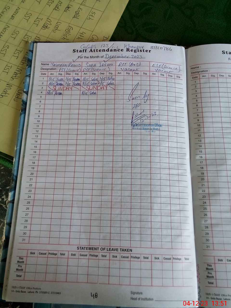 | Name: Ya**** Ra**** Designation: (School Headmaster's/Headmistress's) E S E Science Math Phone/Cell Number: 03**** |