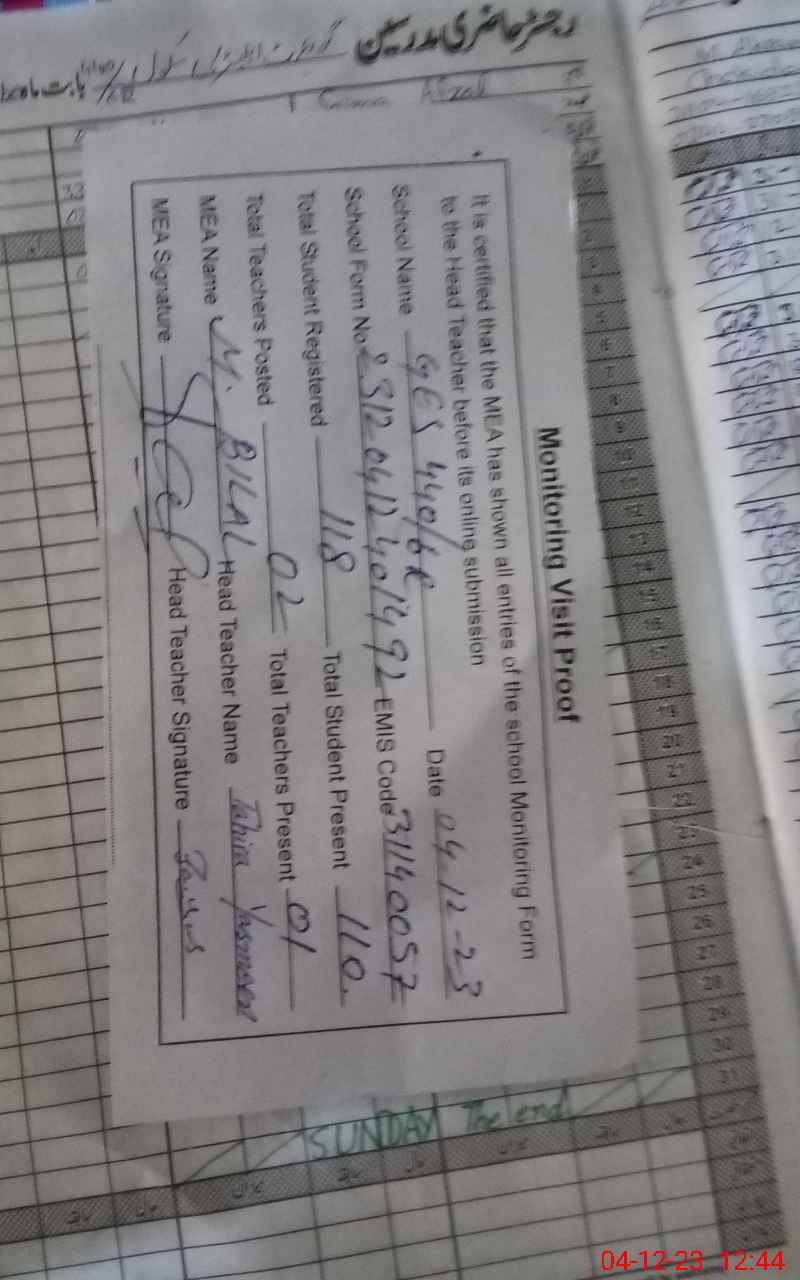 | Attendance Register | Head Teacher | MEA with School | Visit Proof |
