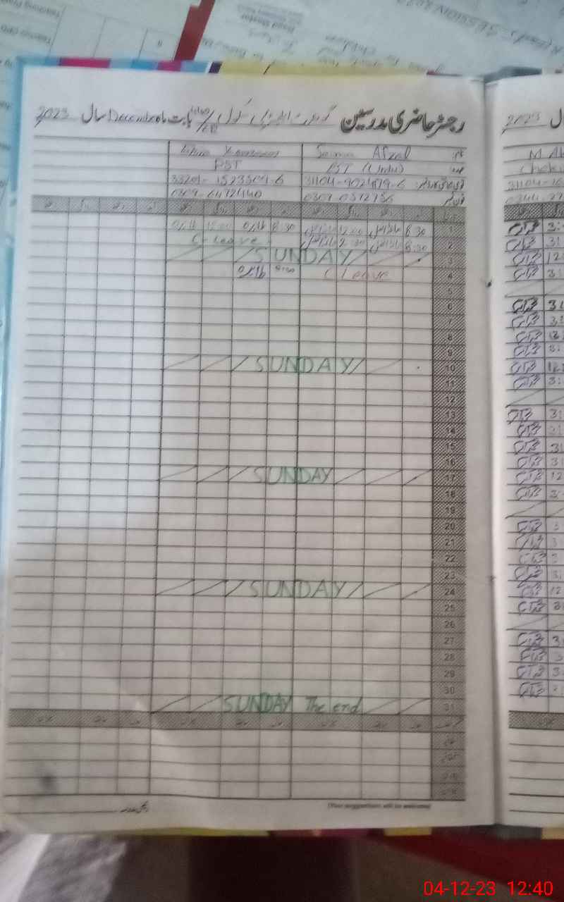 | CNIC | Full Name | Designation | R/C | Absence During Last Calender Month |