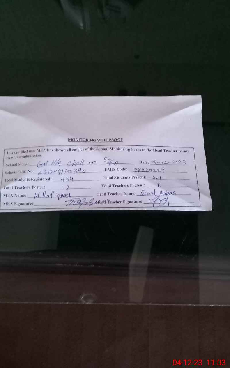 | EMIS Code: 38220229 | Name of School: GHS CHAK NO.52 DB | |||