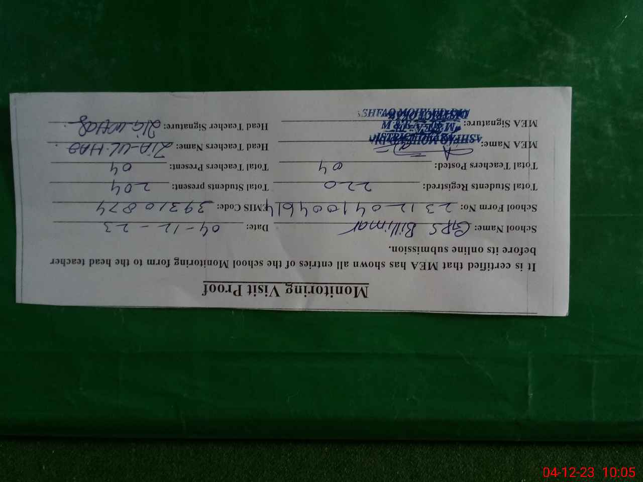 | Attendance Register | Head Teacher | MEA with School | Visit Proof |