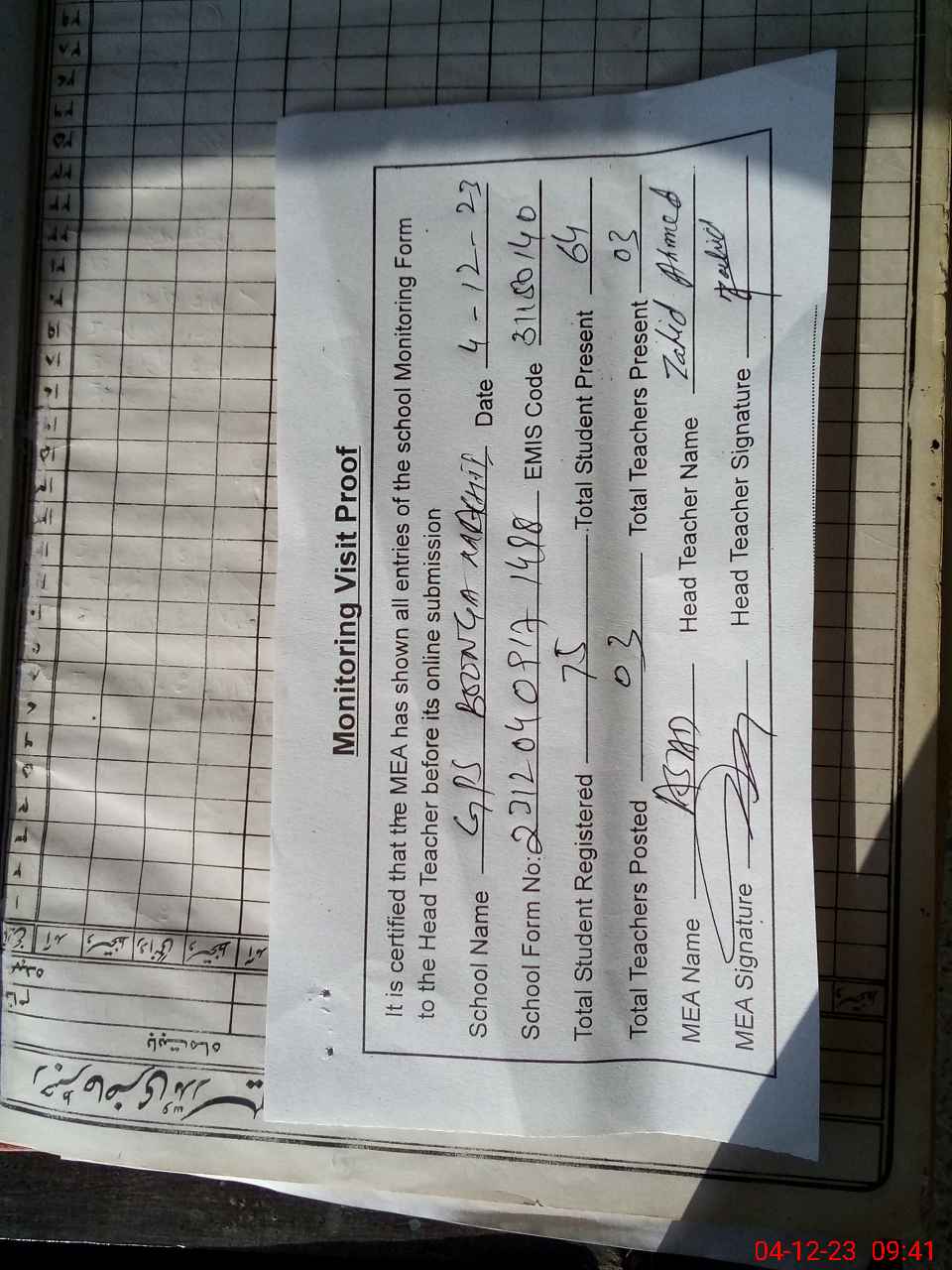 | Attendance Register | Head Teacher | MEA with School | Visit Proof |