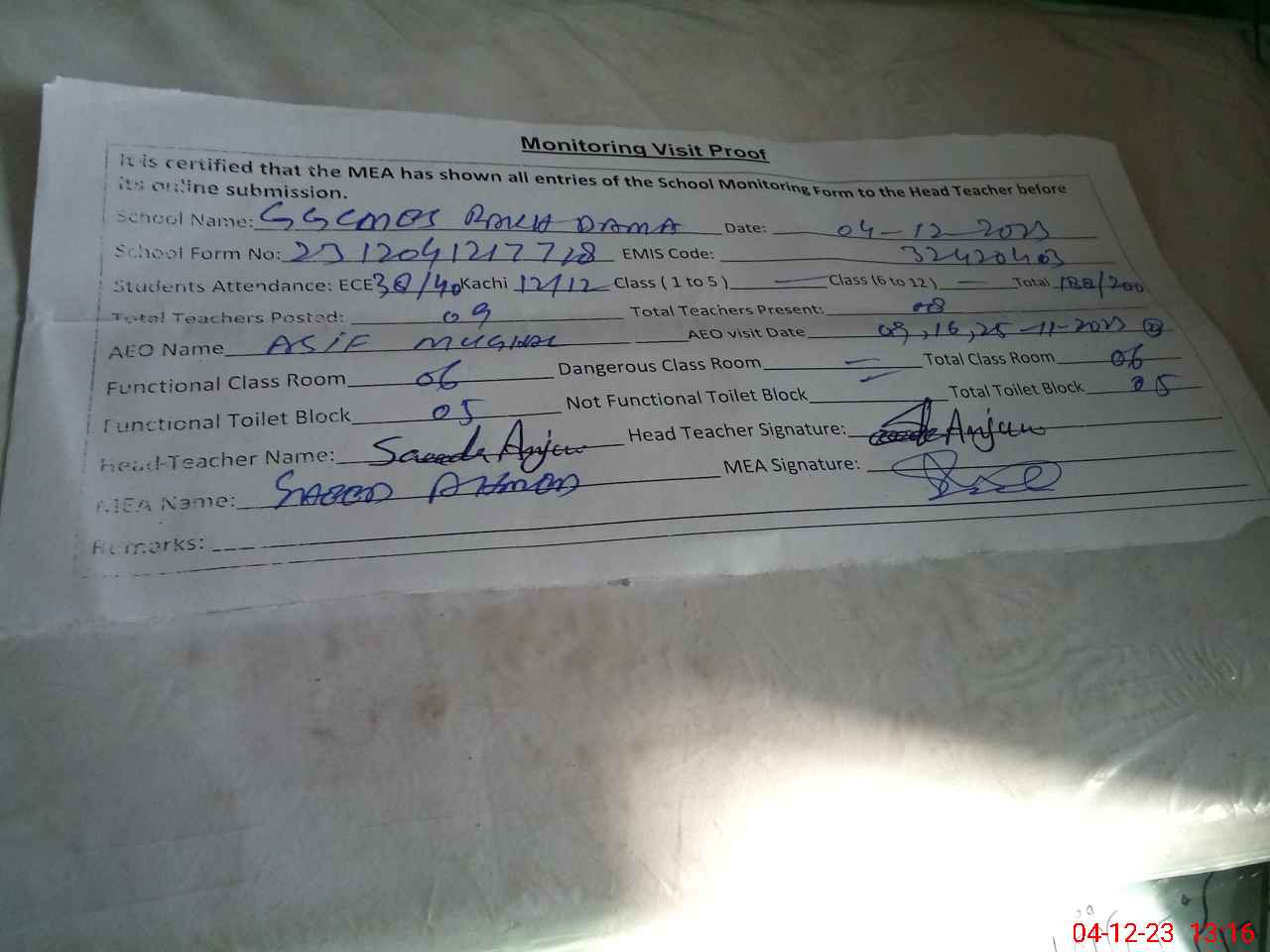 | Attendance Register | Head Teacher | MEA with School | Visit Proof |