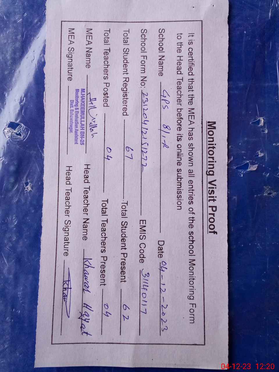 | Attendance Register | Head Teacher | MEA with School | Visit Proof |