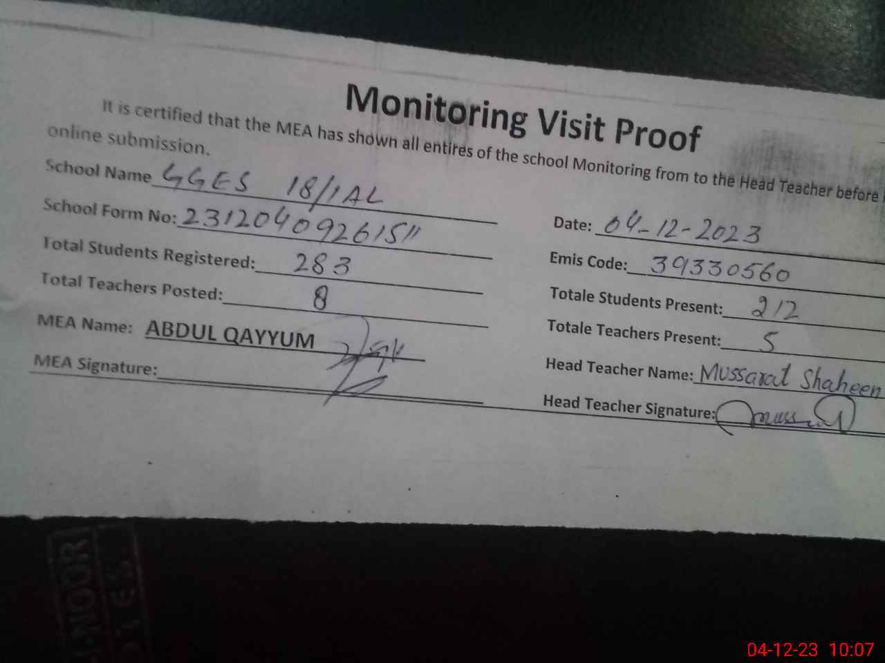 | Attendance Register | Head Teacher | MEA with School | Visit Proof |