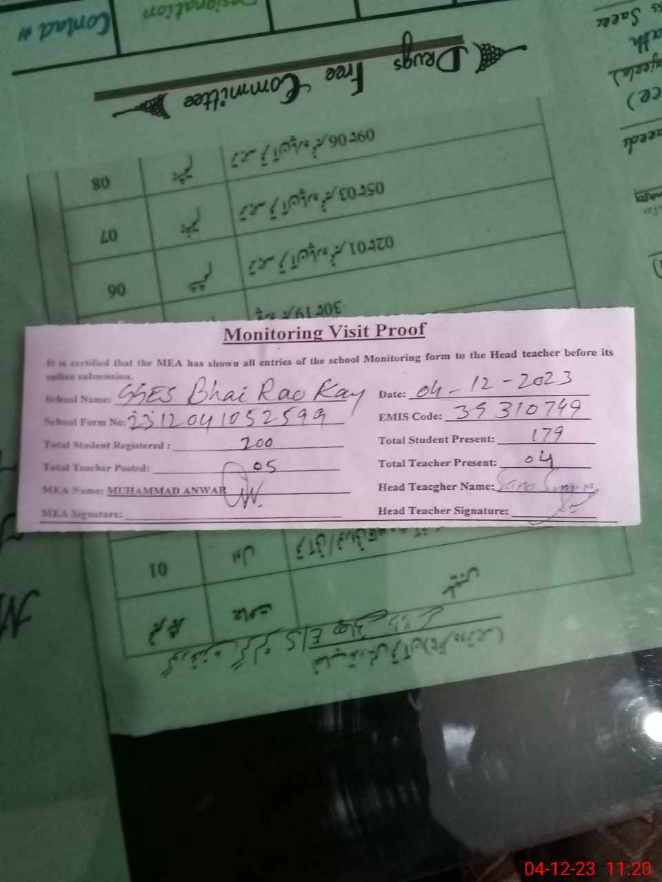 | Attendance Register | Head Teacher | MEA with School | Visit Proof |