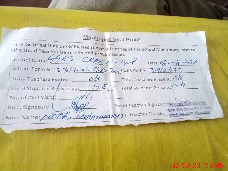 | EMIS Code: 31310437 | Name of School: GGES CHAK NO 14/P | |||