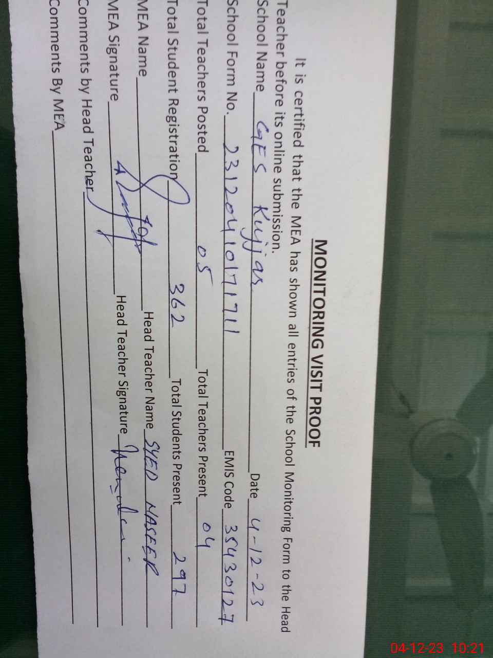 | Attendance Register | Head Teacher | MEA with School | Visit Proof |