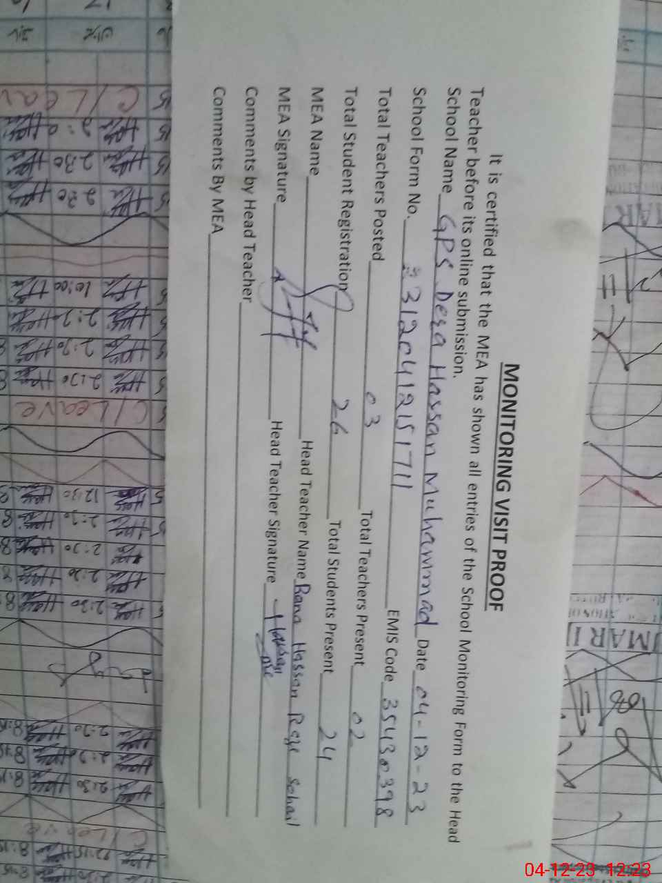 | Attendance Register | Head Teacher | MEA with School | Visit Proof |